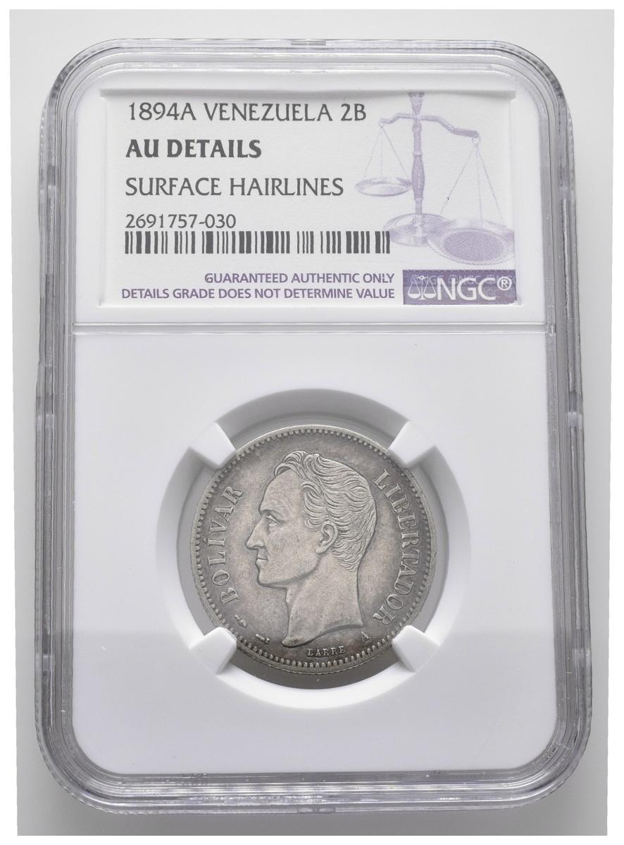ESTADOS UNIDOS DE VENEZUELA. 2 Bolívares. (Ar. 10,00g/27mm). 1894. París. (Km#23). Encapsulado NGC AU Details. Rayitas.