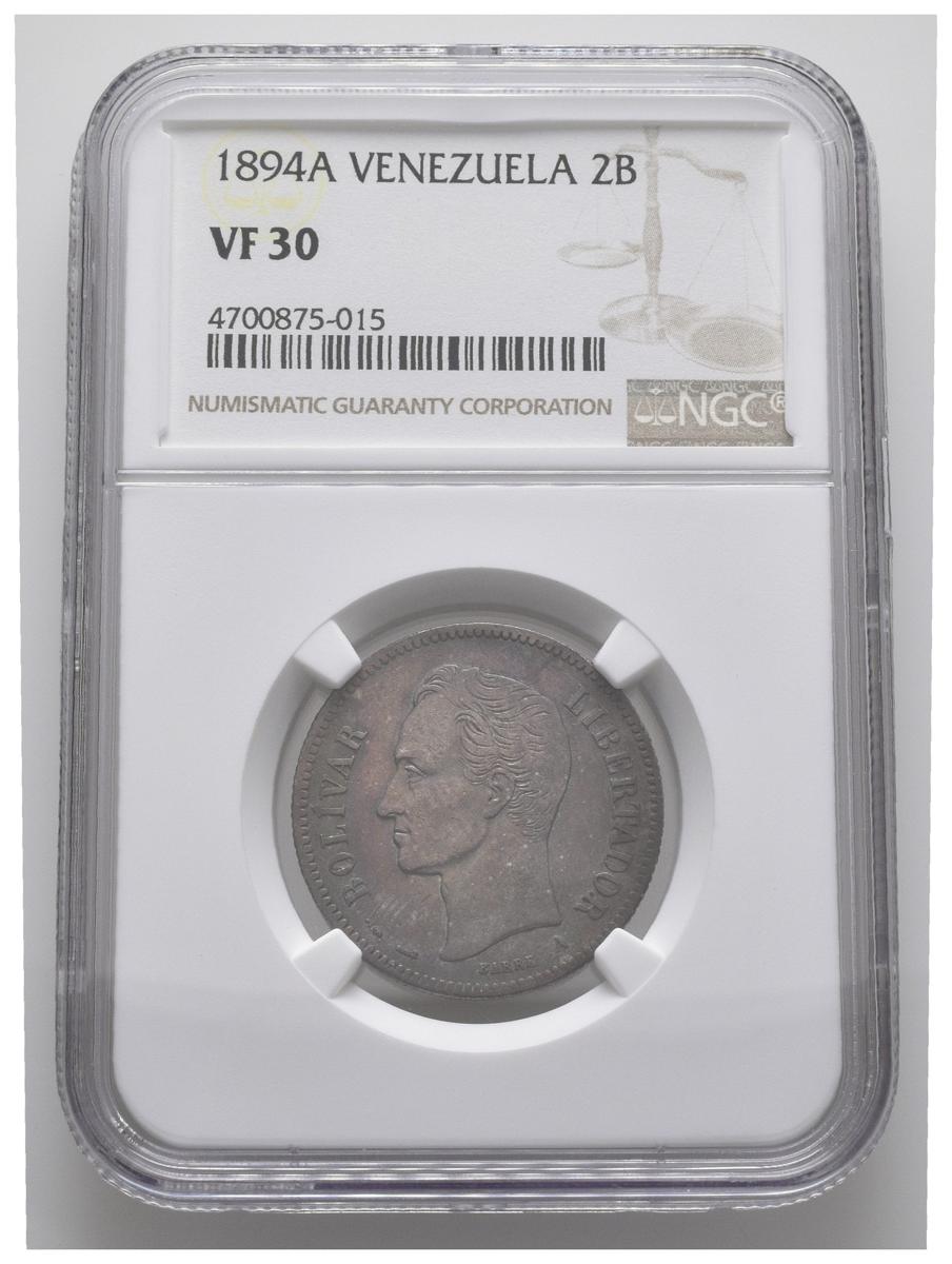ESTADOS UNIDOS DE VENEZUELA. 2 Bolívares. (Ar. 10,00g/27mm). 1894. París A. (Km#Y23). Encapsulado NGC VF-30.