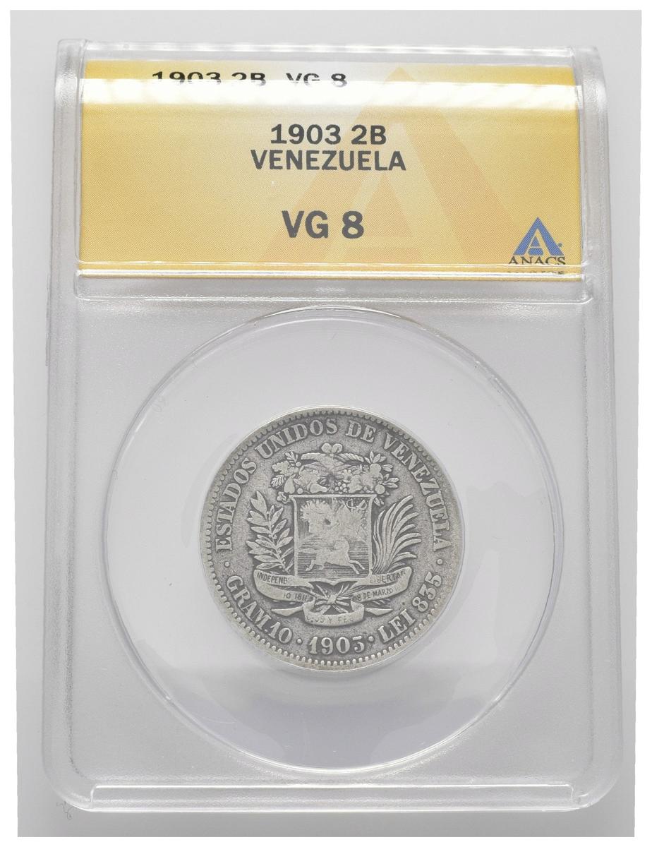 ESTADOS UNIDOS DE VENEZUELA. 2 Bolívares. (Ar. 10,00g/27mm). 1903. Philadelphia. (Km#Y23). Encapsulado ANACS VG-8.