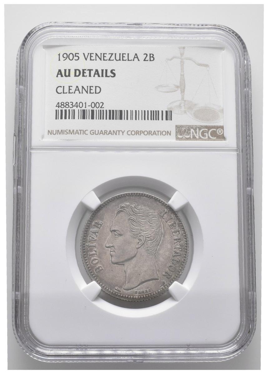 ESTADOS UNIDOS DE VENEZUELA. 2 Bolívares. (Ar. 10,00g/27mm). 1905. Philadelphia. (Km#Y23). Encapsulado NGC AU Details. Limpiada.