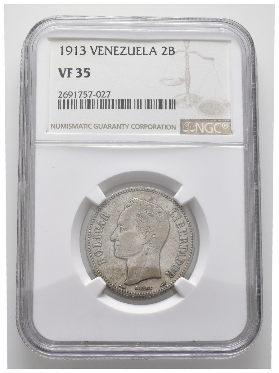 ESTADOS UNIDOS DE VENEZUELA. 2 Bolívares. (Ar. 10,00g/27mm). 1913. Philadelphia. (Km#Y23). Encapsulado NGC VF-35.