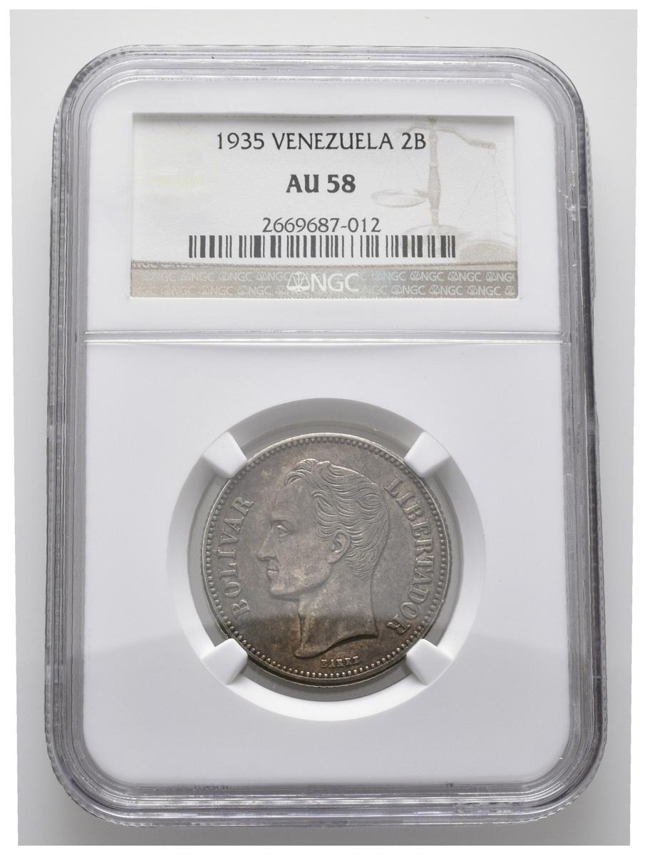 ESTADOS UNIDOS DE VENEZUELA. 2 Bolívares. (Ar. 10,00g/27mm). 1935. Philadelphia. (Km#Y23). Encapsulado NGC AU-58.