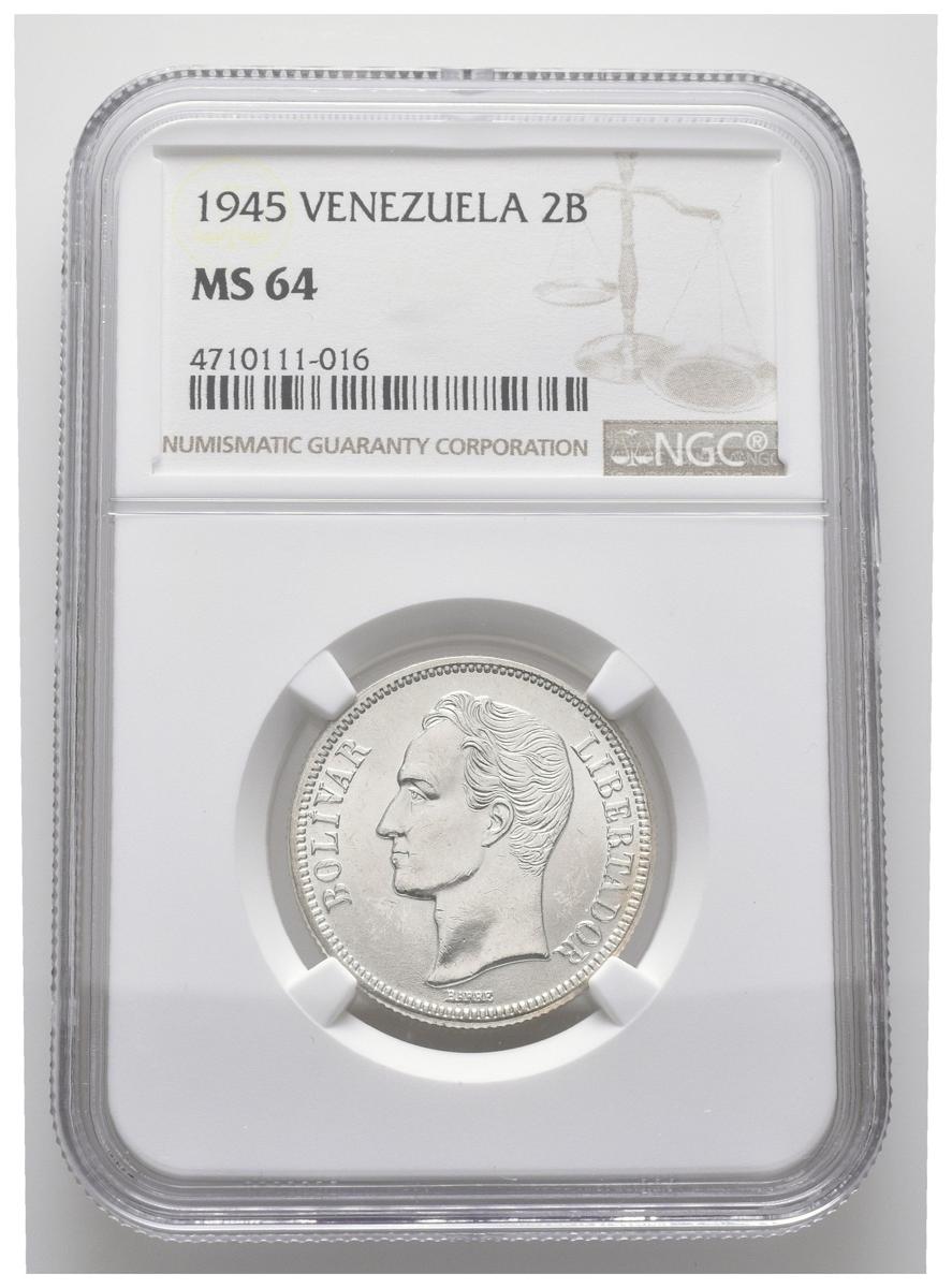 ESTADOS UNIDOS DE VENEZUELA. 2 Bolívares. (Ar. 10,00g/27mm). 1945. Philadelphia. (Km#Y23). Encapsulado NGC MS-64.