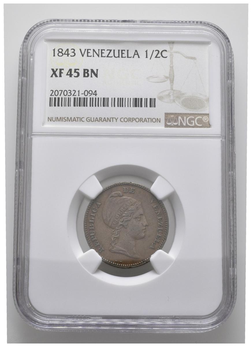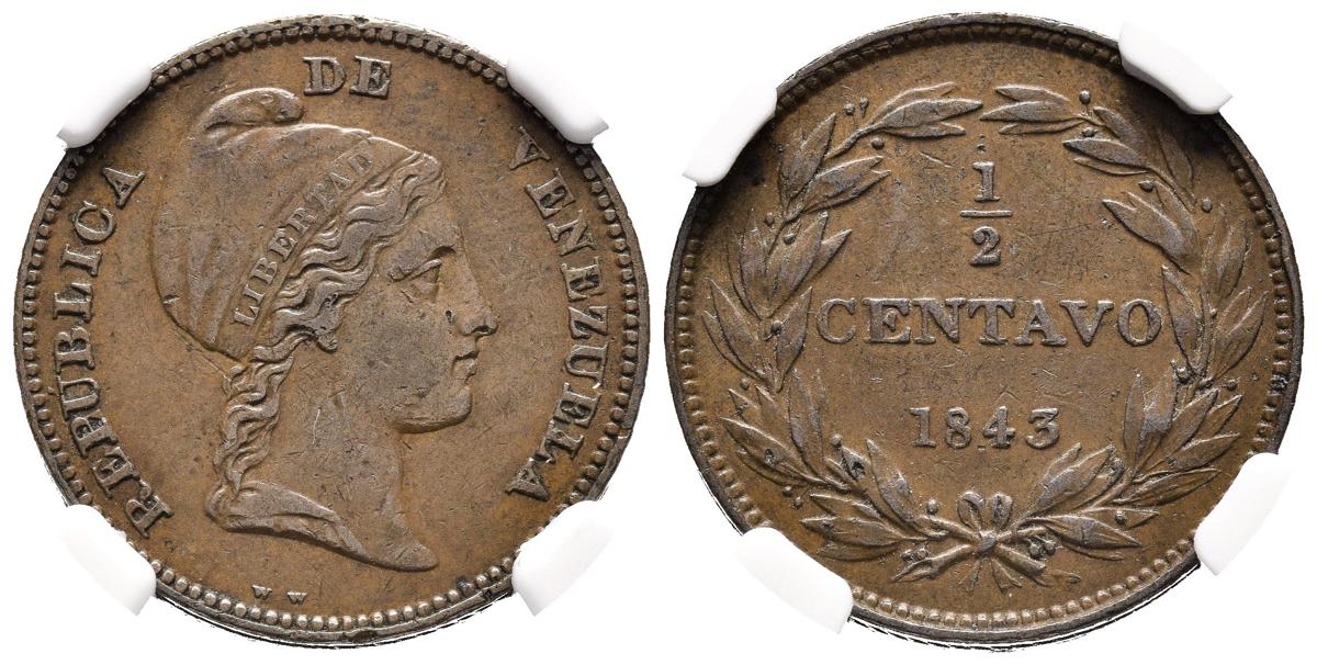 REPÚBLICA DE VENEZUELA. 1/2 Centavo. (Cu. 6,00g/23mm) 1843 WW. (Km#Y2). Encapsulado NGC XF-45.