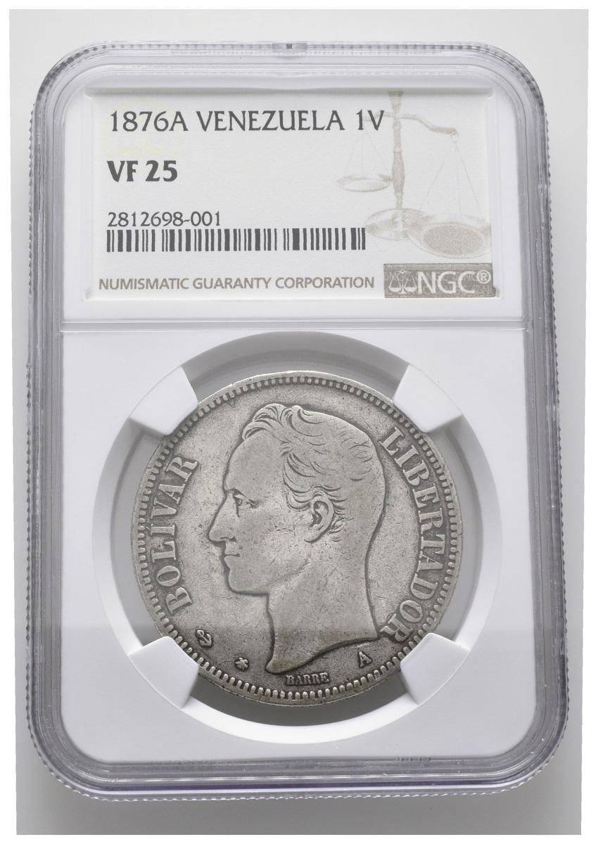 ESTADOS UNIDOS DE VENEZUELA. 1 Venezolano. (Ar. 25g/37mm). 1876. París A. (Km#Y16). Encapsulado NGC VF-25.