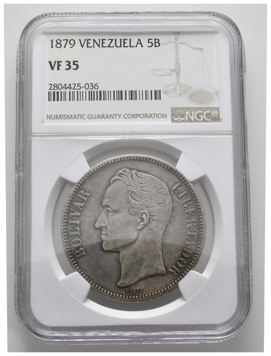 ESTADOS UNIDOS DE VENEZUELA. 5 Bolívares (Ar. 25,00g/37mm). 1879 (primer año de esta serie). Bruselas. (Km#Y24.1). Encapsulado NGC VF-35. Rara.