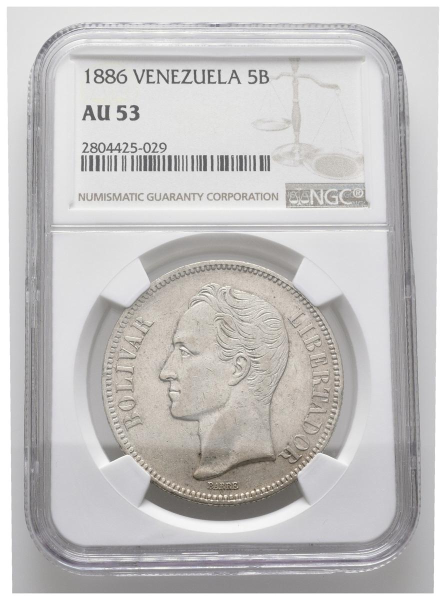 ESTADOS UNIDOS DE VENEZUELA. 5 Bolívares. (Ar. 25,00g/37mm). 1886. Caracas. (Km#Y24.1). Encapsulado NGC AU-53.