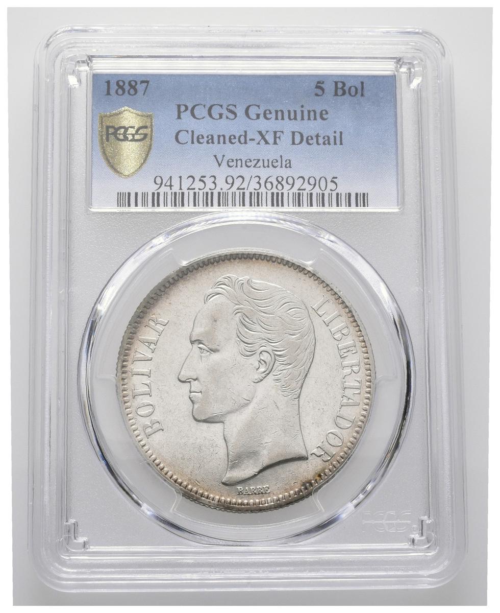 ESTADOS UNIDOS DE VENEZUELA. 5 Bolívares. (Ar. 25,00g/37mm). 1887. Caracas. (Km#Y24.1). Encapsulado PCGS XF Details. Limpiada.