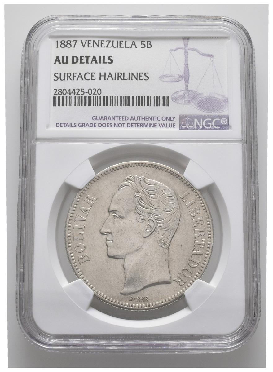 ESTADOS UNIDOS DE VENEZUELA. 5 Bolívares. (Ar. 25,00g/37mm). 1887. (Km#Y24.1). Encapsulado NGC AU Details. Rayitas.