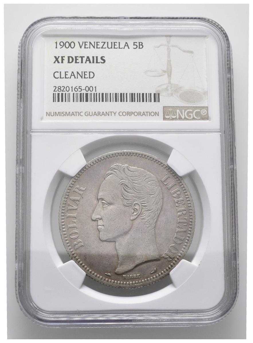 ESTADOS UNIDOS DE VENEZUELA. 5 Bolívares. (Ar. 25,00g/37mm). 1900. Philadelphia. (Km#Y24.2). Encapsulado NGC XF Detail. Limpiada.