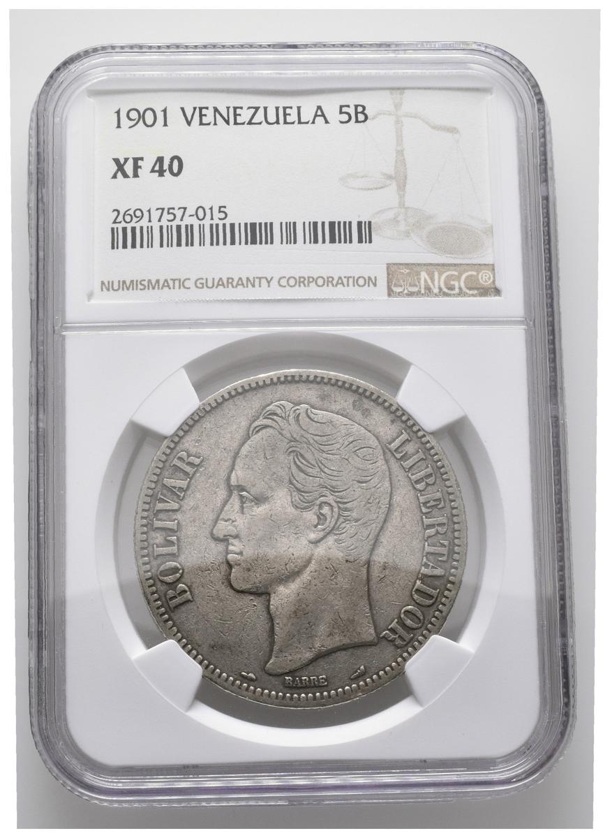 ESTADOS UNIDOS DE VENEZUELA. 5 Bolívares. (Ar. 25,00g/37mm). 1901. Philadelphia. (Km#Y24.2). Encapsulado NGC XF-40.