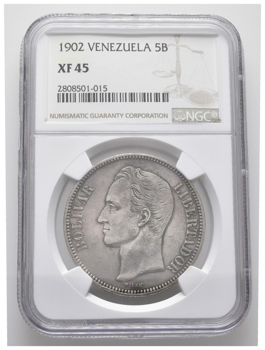 ESTADOS UNIDOS DE VENEZUELA. 5 Bolívares. (Ar. 25,00g/37mm). 1902. Philadelphia. (Km#Y24.2). Encapsulado NGC XF-45.