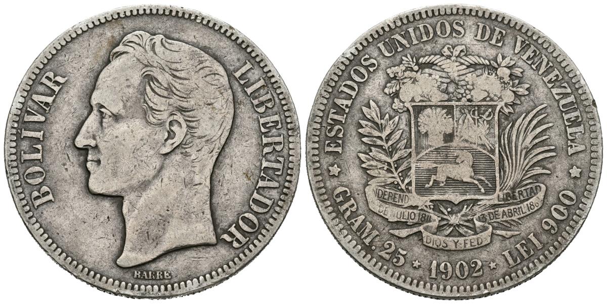 ESTADOS UNIDOS DE VENEZUELA. 5 Bolívares. (Ar. 24,65g/37mm). 1902. Caracas. (Km#Y24.2). MBC.