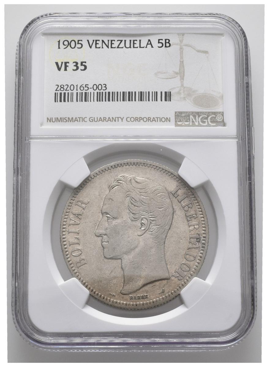 ESTADOS UNIDOS DE VENEZUELA. 5 Bolívares. (Ar. 25,00g/37mm). 1905. París. (Km#Y24.2). Encapsulado NGC VF-35.
