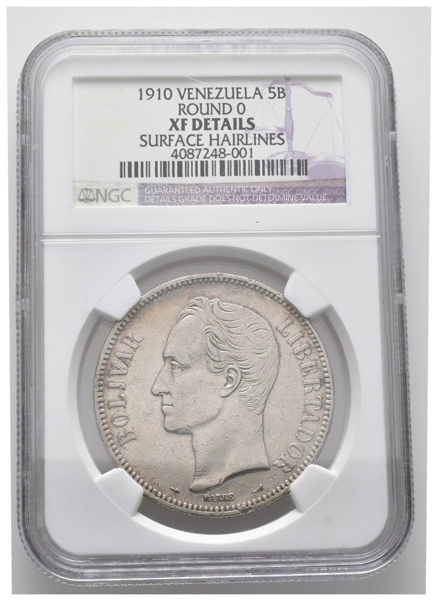 ESTADOS UNIDOS DE VENEZUELA. 5 Bolívares. (Ar. 25,00g/37mm). 1910. Philadelphia. (Km#Y24.2). Variante "ROUND 0". Encapsulado NGC XF Details. Rayitas superficiales.