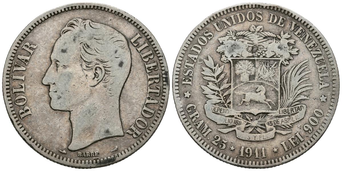 ESTADOS UNIDOS DE VENEZUELA. 5 Bolívares. (Ar. 24,67g/37mm). 1911. (Km# Y24.2). MBC-.