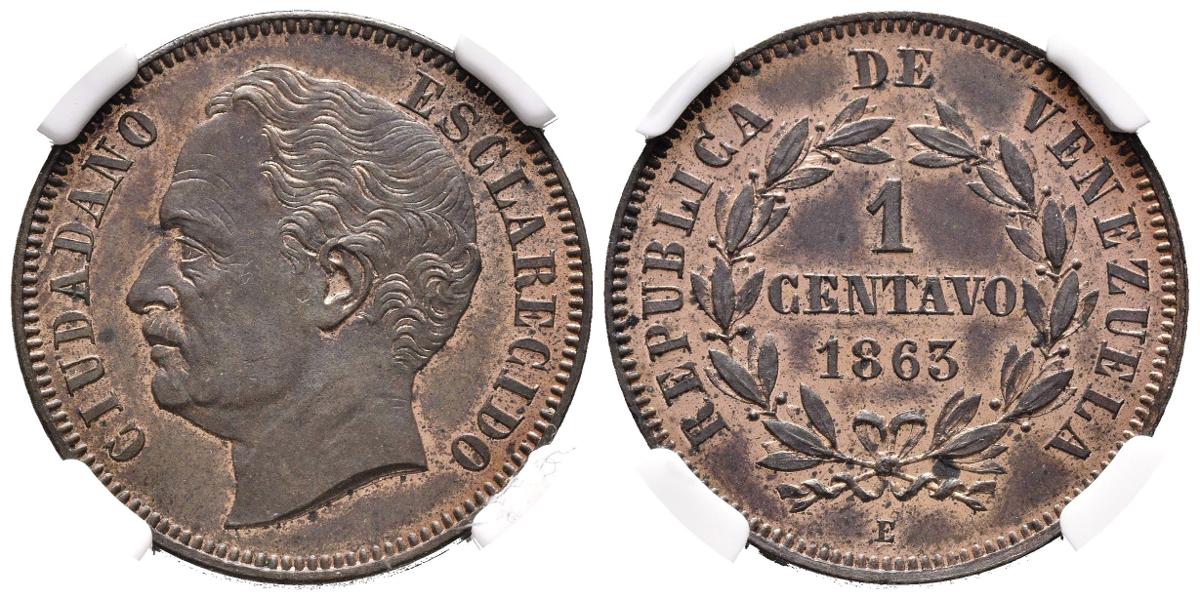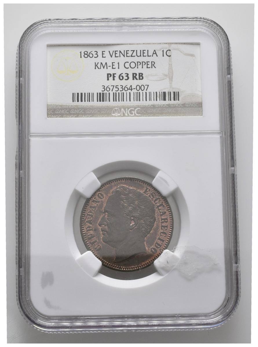 REPÚBLICA DE VENEZUELA. 1 Centavo. (Cu. 6,50g/25mm). 1863. París E. (Km#E1). Prueba. Encapsulado NGC PF-63. Rara y más en esta conservación.