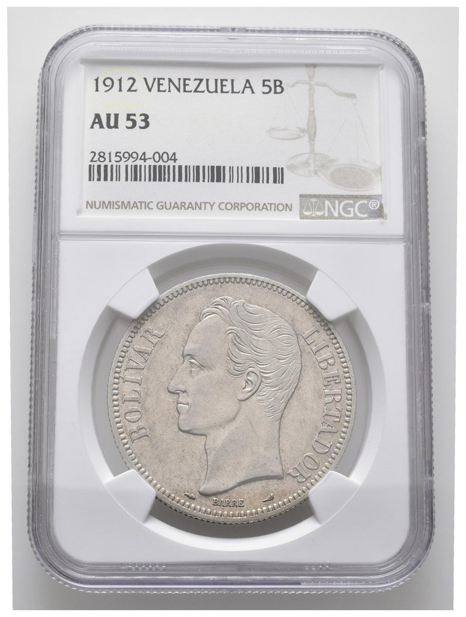 ESTADOS UNIDOS DE VENEZUELA. 5 Bolívares. (Ar. 25,00g/37mm). 1912. Philadelphia. (Km#Y24.2). Encapsulado NGC AU-53.