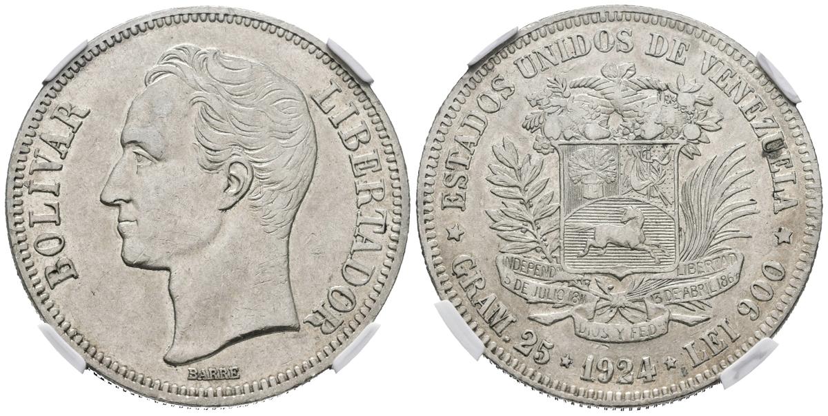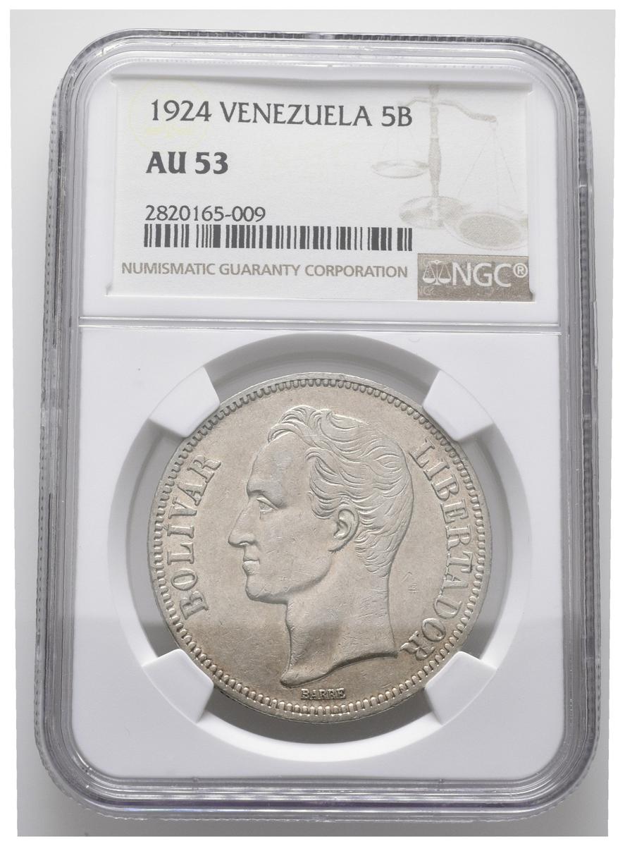 ESTADOS UNIDOS DE VENEZUELA. 5 Bolívares. (Ar. 25,00g/37mm). 1924. Philadelphia. (Km#Y24.2). Encapsulado NGC AU-53.