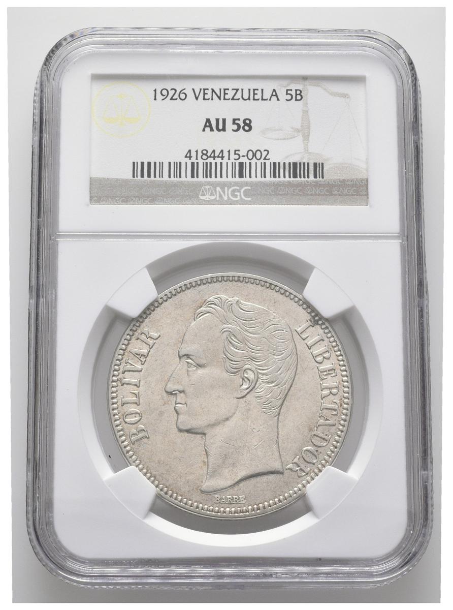 ESTADOS UNIDOS DE VENEZUELA. 5 Bolívares. (Ar. 25,00g/37mm). 1926. Philadelphia. (Km#Y24.2). Encapsulado NGC AU-58.