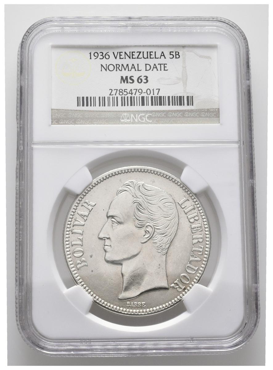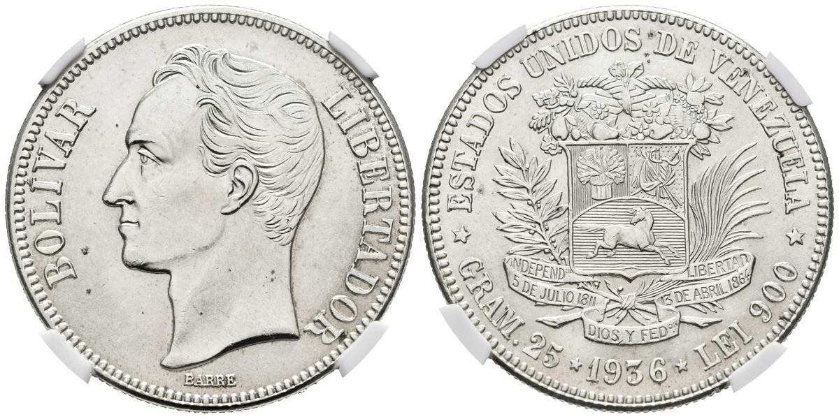 ESTADOS UNIDOS DE VENEZUELA. 5 Bolívares. (Ar. 25,00g/37mm). 1936. Philadelphia. (Km#Y24.2). Encapsulado NGC MS-63.
