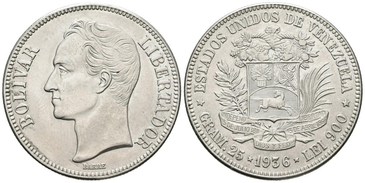 ESTADOS UNIDOS DE VENEZUELA. 5 Bolívares. (Ar. 25,00g/37mm). 1936. Philadelphia. (Km#Y24.2). SC.