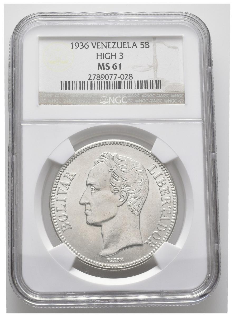 ESTADOS UNIDOS DE VENEZUELA. 5 Bolívares. (Ar. 25,00g/37mm). 1936. Philadelphia. (Km#Y24.2). Variante 3 alto. Encapsulado NGC MS-61.