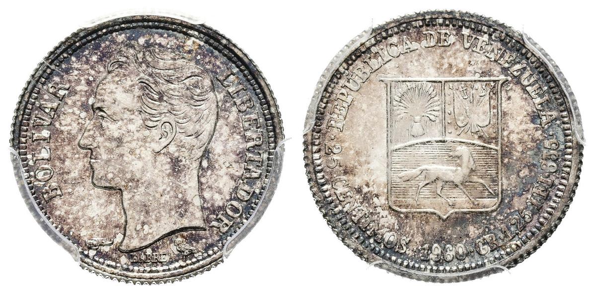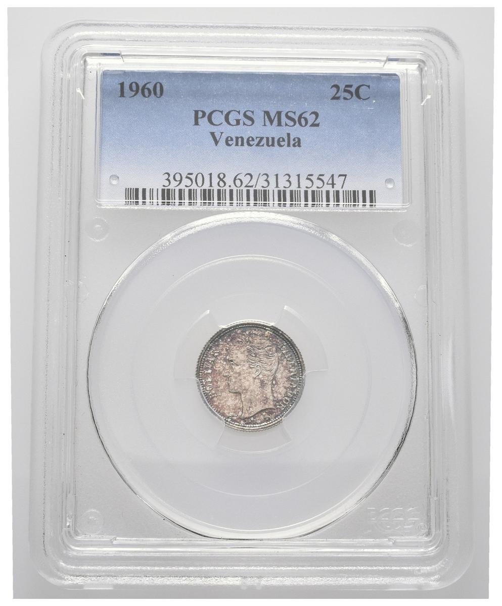 REPÚBLICA DE VENEZUELA. 1/4 Bolívar. (Ar. 1,25g/16mm). 1960. (Km#Y35a). Encapsulado PCGS MS-62.