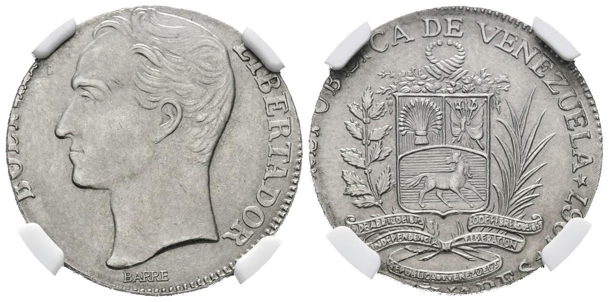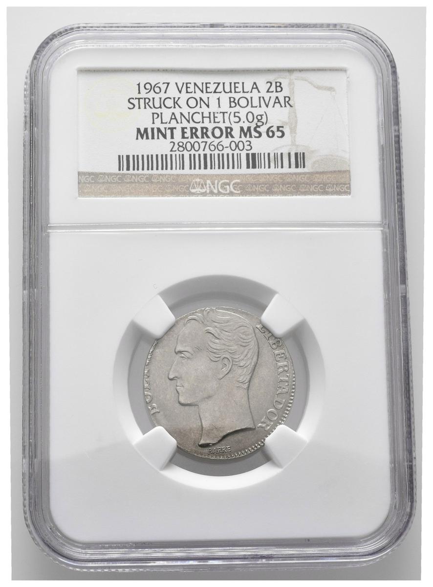 REPÚBLICA DE VENEZUELA. 2 Bolívares.(Ni. 5,00g/23mm). 1967. Londres. (Km#Y43). "MINT ERROR": Acuñada en módulo de 1 Bolívar. Encapsulado NGC MS-65