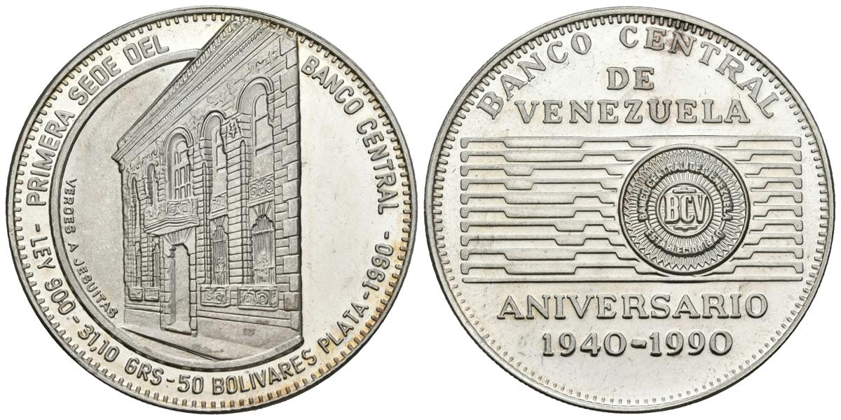 REPÚBLICA DE VENEZUELA. 50 Bolívares. (Ar. 31,10g/35mm). 1990. 50 Aniversario de la primera sede del Banco Central. (Km#Y66). SC-.