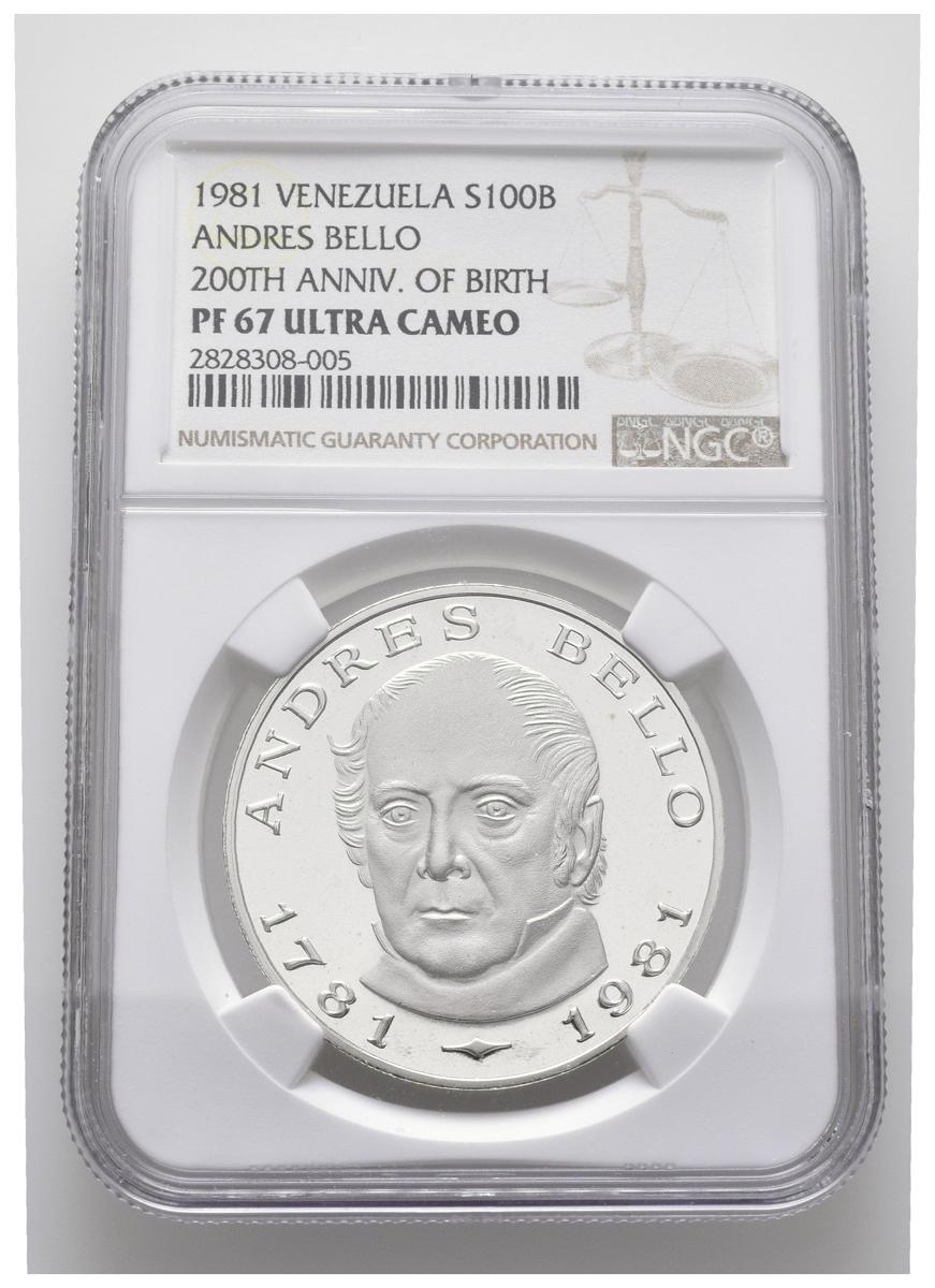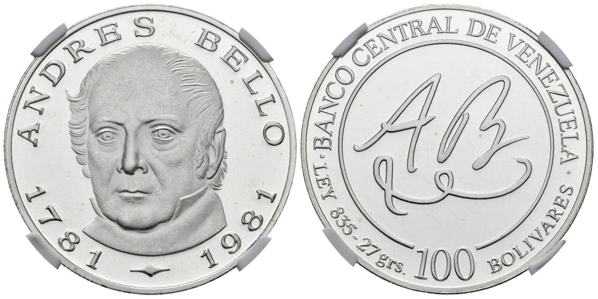 REPÚBLICA DE VENEZUELA. 100 Bolívares. (Ar. 27,00g/ 36mm). 1981. 200 Aniversario del nacimiento de Andrés Bello. (Km#Y57). Encapsulado NGC PF-67 ULTRA CAMEO.