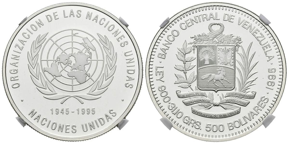 REPÚBLICA DE VENEZUELA. 500 Bolívares. (Ar. 31,10g/35mm). 1995. Organización de las Naciones Unidas. (Km#Y71). Encapsulado NGC PF-68 ULTRA CAMEO.