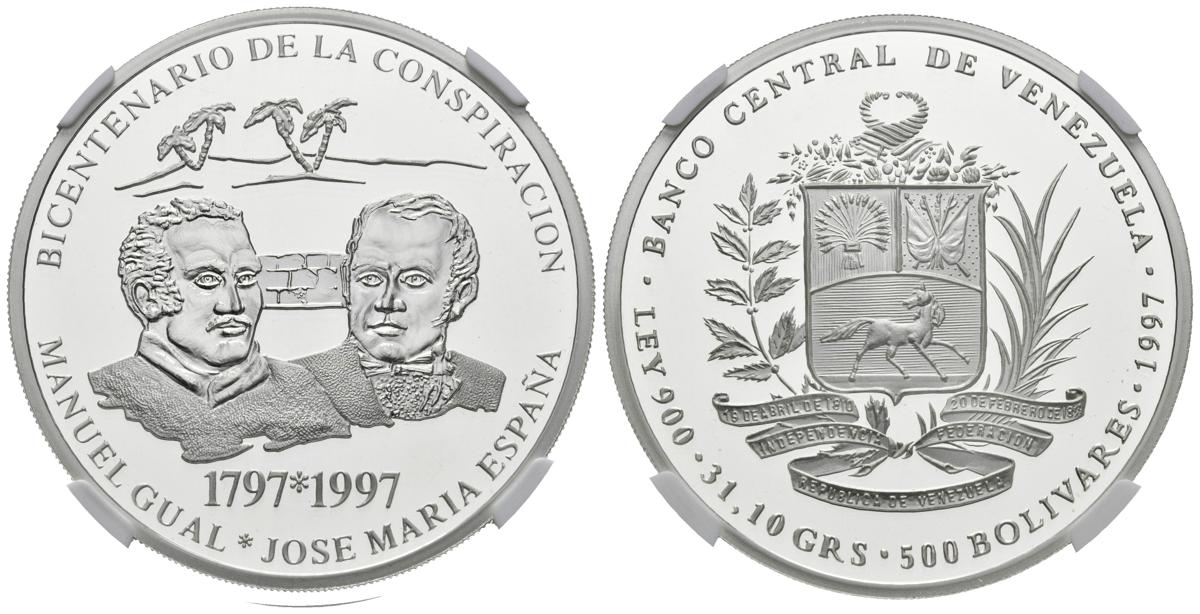 REPÚBLICA DE VENEZUELA. 500 Bolívares. (Ar. 31.10g/39mm). 1997. Bicentenario de la Conspiración 1797-1997. (Km#Y27). Encapsulado NGC PF-69 ULTRA CAMEO.
