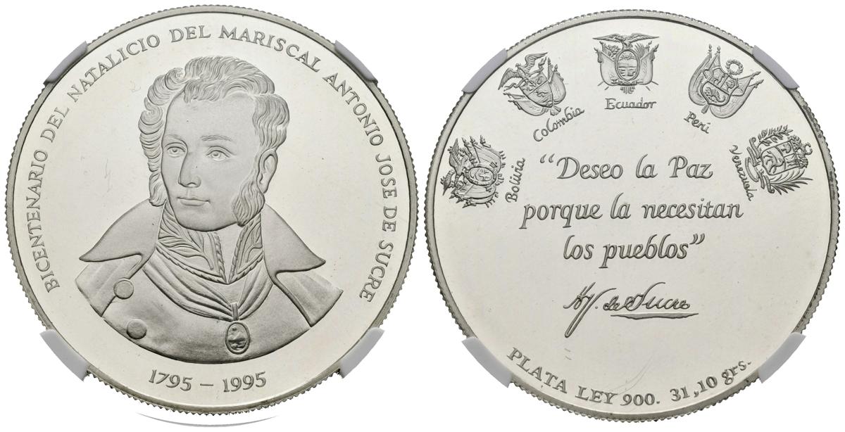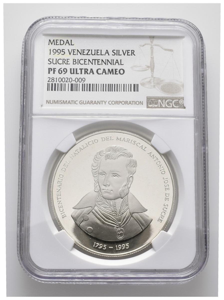 REPÚBLICA DE VENEZUELA. Medalla. 1995. (Ar. 31,10g/40mm). Con motivo de conmemorarse los Doscientos Años del Natalicio del Gran Mariscal de Ayacucho Antonio José de Sucre en el año 1995, los Bancos Centrales de Bolivia, Colombia, Ecuador, Perú y Venezuela decidieron realizar un homenaje común mediante la acuñación de una Medalla de oro y una de plata que fuese oficial en los cinco países andinos bolivarianos. Las medallas fueron acuñadas en la Monniae Royale Canadienne (Royal Canadian Mint). Encapsulado NGC PF-69 ULTRA CAMEO.