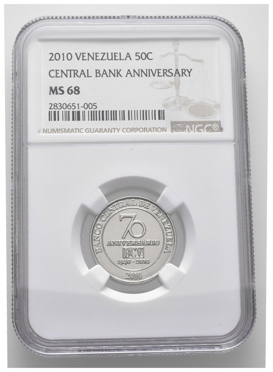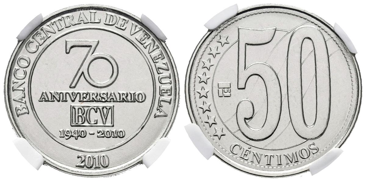 REPÚBLICA BOLIVARIANA DE VENEZUELA. 50 Céntimos. (Acero niquelado. 4,30g/21,90mm). Caracas. (Km#Y100). Conmemoración 70 Aniversario del Banco Central. Encapsulado NGC MS-68.