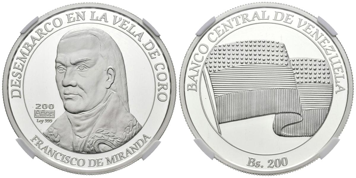 REPÚBLICA BOLIVARIANA DE VENEZUELA. 200 Bolívares. 2010. (Ar. 31,10g/38mm). 2010. Desembarco en la Vela de Coro. Francisco de Miranda. (Km#Y97). Encapsulado NGC PF-69.
