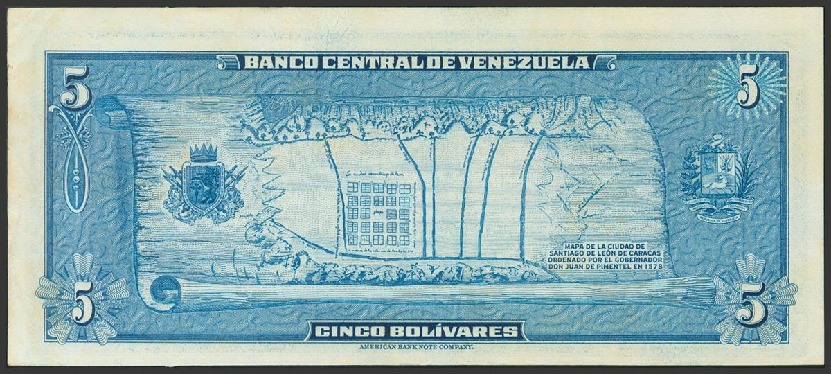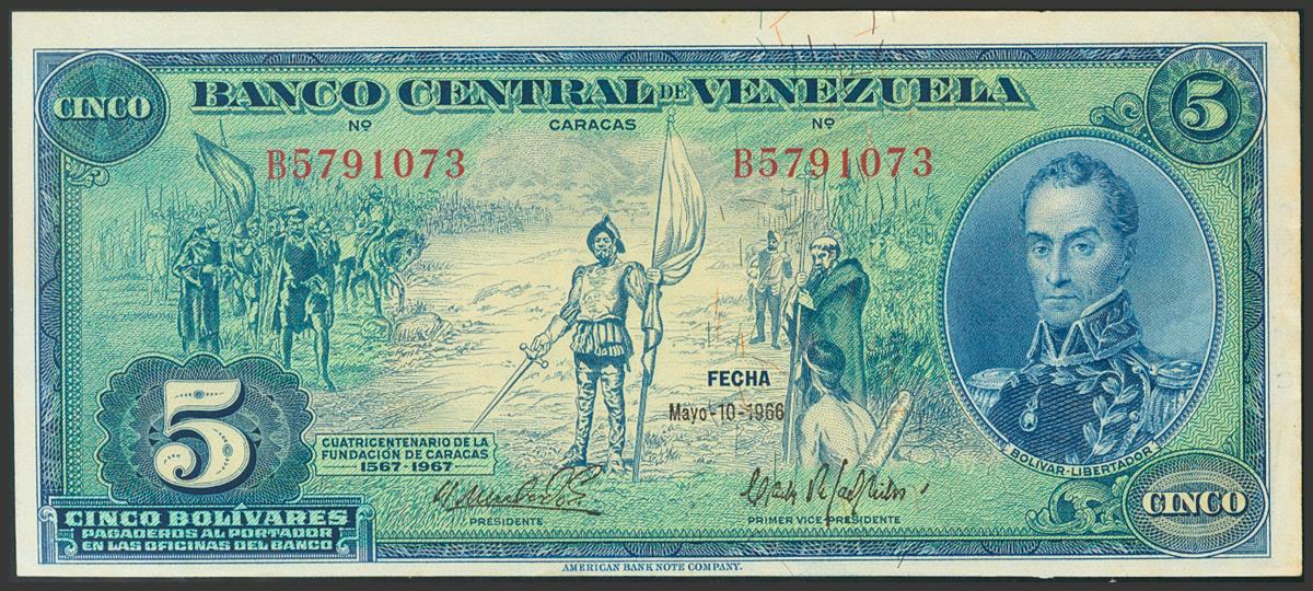 VENEZUELA. 5 Bolívares. 10 de Mayo de 1966. Firmado por Alfredo Machado Gómez y Carlos Rafae Silva. Serie B. (Pick: 49, Sleiman: 2). EBC.