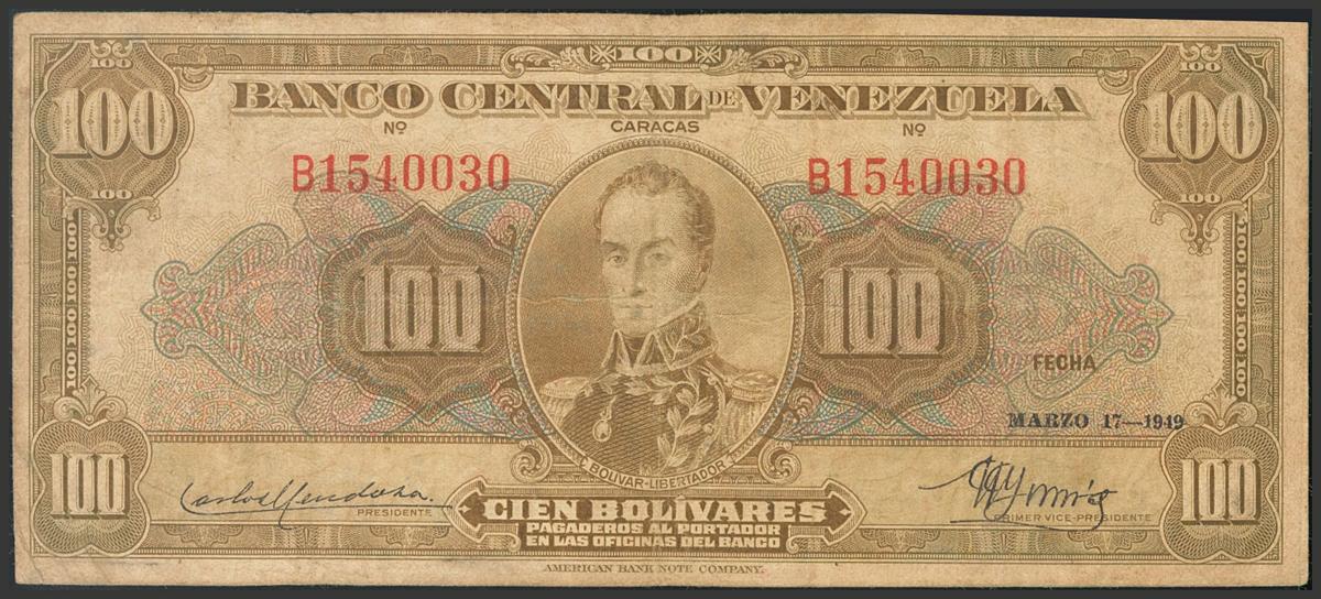 VENEZUELA. 100 Bolívares. 17 de Marzo de 1949. Firmas de Carlos Mendoza y González Gorrondona. Serie B. (Pick: 34a, Sleiman: 30). MBC.