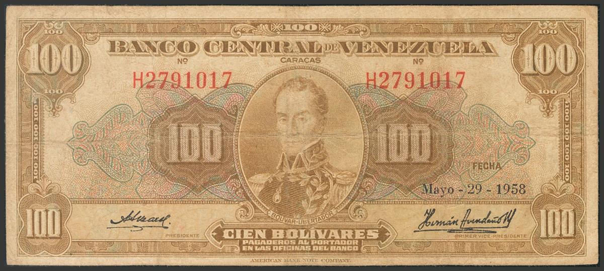 VENEZUELA. 100 Bolívares. 29 de Mayo de 1958. Serie H. (Pick: 34c, Sleiman: 62). MBC.