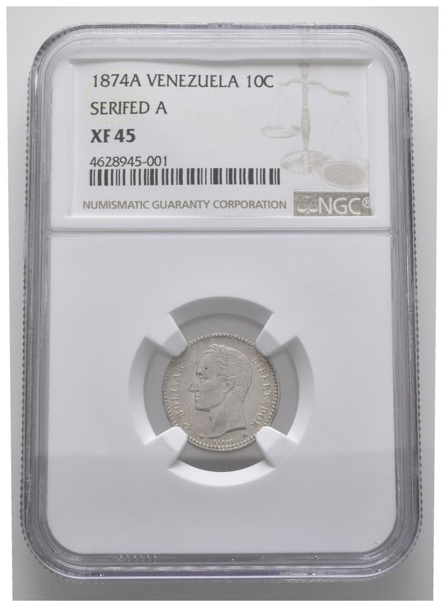 ESTADOS UNIDOS DE VENEZUELA. 10 Centavos. (Ar. 2,50g/18mm). 1874. París A. (Km#Y13.1). Variante "Serifed A". Encapsulado NGC XF-45. Ligero tono rojizo. Rara en esta conservación.