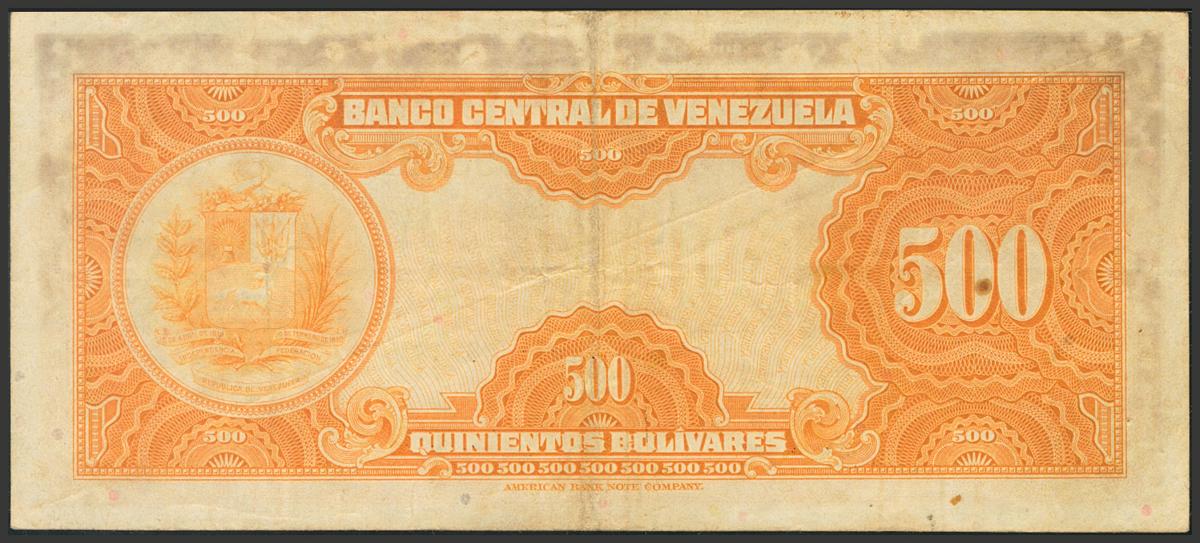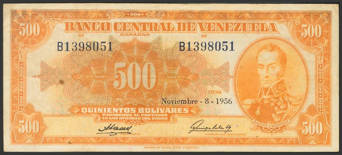 VENEZUELA. 500 Bolívares. 8 de Noviembre de 1956. Firmado por Aurelio Arreza y Enrique Salas. Serie B. (Pick:37b, Sleiman: 24). MBC+.