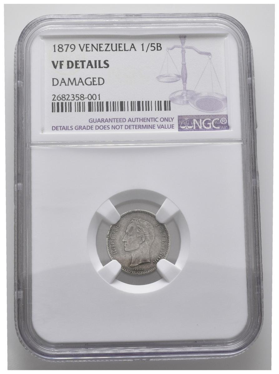 ESTADOS UNIDOS DE VENEZUELA. 1/5 Bolívar. (Ar. 1,00g/16mm). 1879. (Km#Y19). Encapsulado NGC VF-Details.