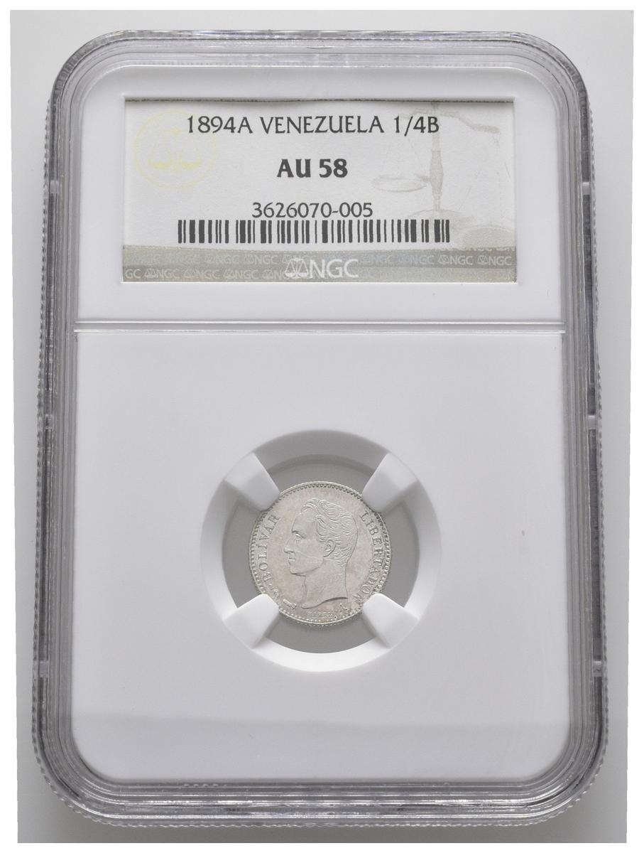 ESTADOS UNIDOS DE VENEZUELA. 1/4 Bolívar. (Ar. 1,25g/15mm). 1894. París A. (Km#Y20). Encapsulado NGC AU-58.