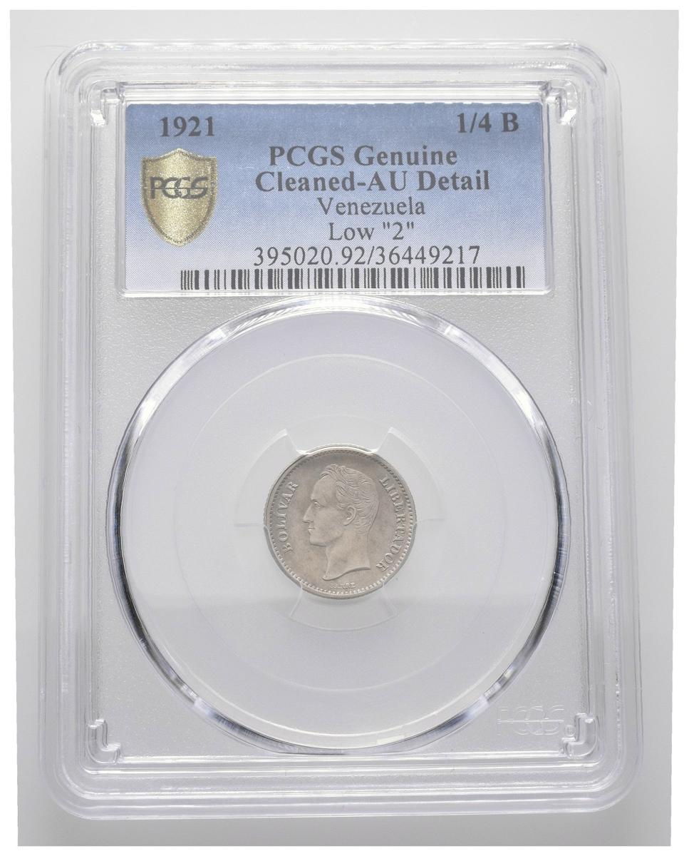 ESTADOS UNIDOS DE VENEZUELA. 1/4 Bolívar. (Ar. 1,25g/15mm). 1921. Philadelphia. (Km#Y20). Variante "Low 2". Encapsulado PCGS AU Details.