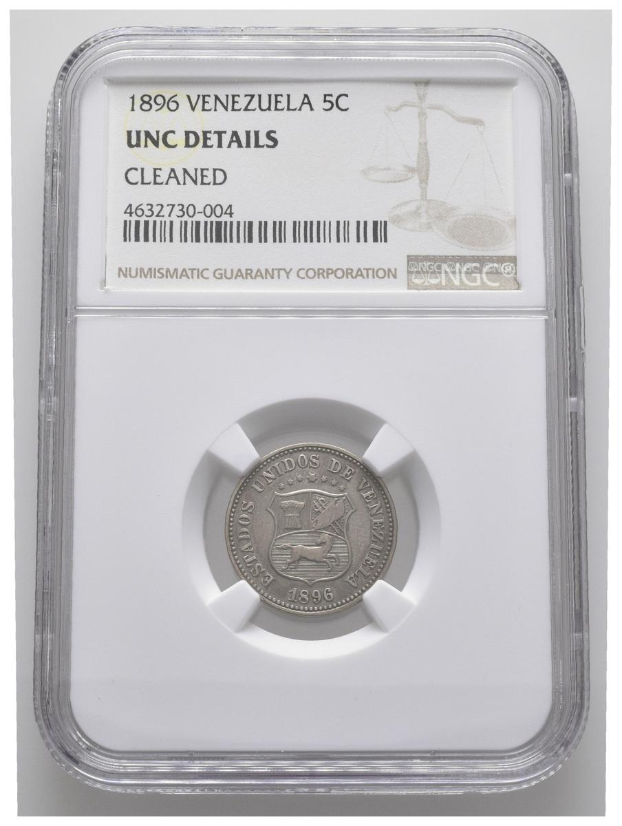 ESTADOS UNIDOS DE VENEZUELA. 5 Céntimos. (CuNi. 2,00g/19mm). 1896. Berlín. (Km#Y27). Encapsulado NGC UNC Details. Limpiada.