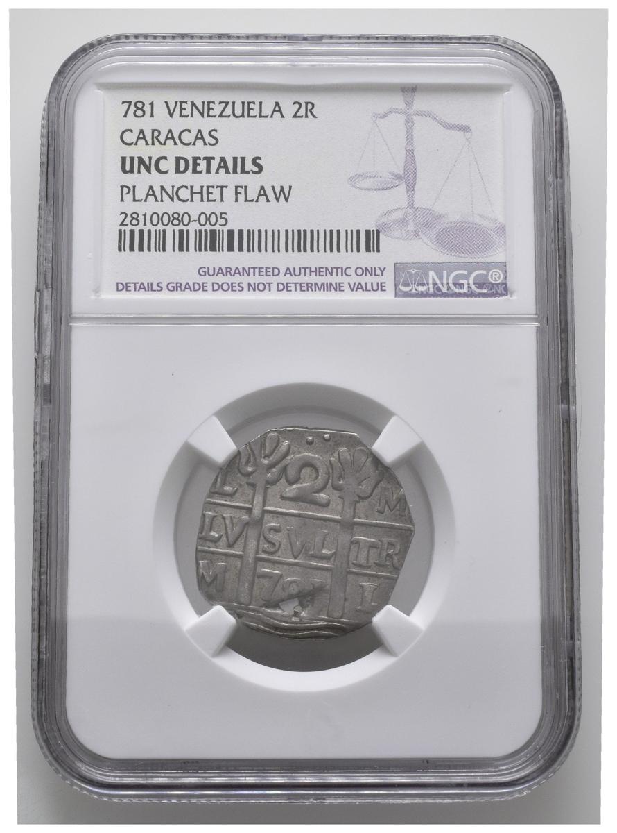 PERIODO DE INDEPENDENCIA. 2 Reales. (Ar. 5,00g/24mm). 781 (principios del s. XIX). Caracas. (Km#C13.1; Cal-752). Encapsulado NGC UNC Details. Defectos de acuñación. Escasa.