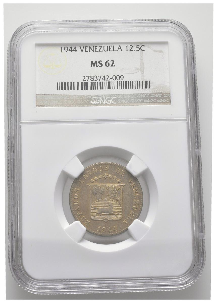 ESTADOS UNIDOS DE VENEZUELA. 12 1/2 Céntimos. (La. 5,00g/23mm). 1944. Denver. (Km#Y30). Encapsulado NGC MS-62.
