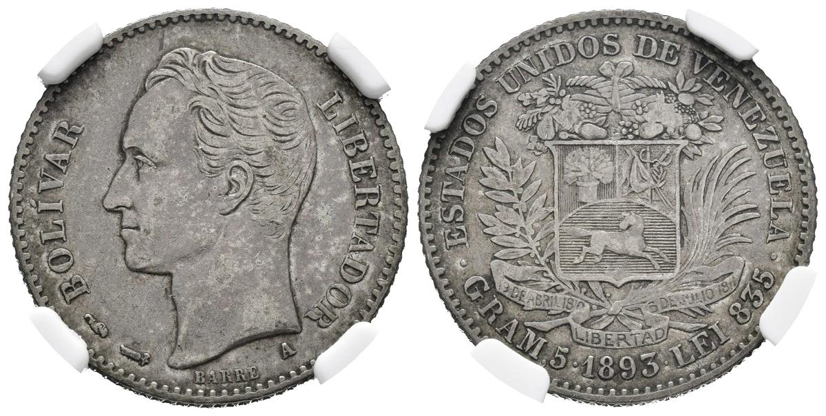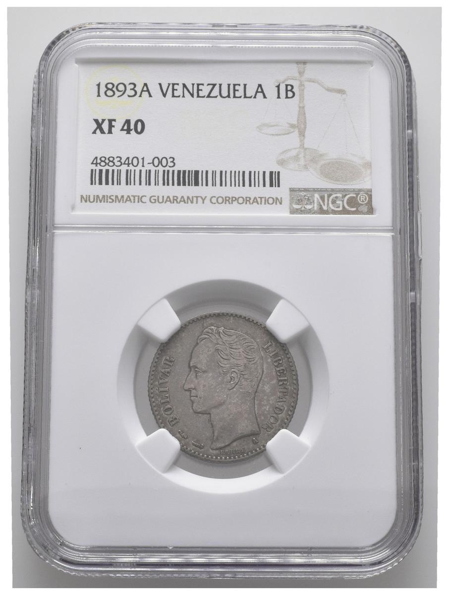 ESTADOS UNIDOS DE VENEZUELA. 1 Bolívar. (Ar. 5,00g/23mm). 1893. París A. (Km#Y22). Encapsulado NGC XF-40.