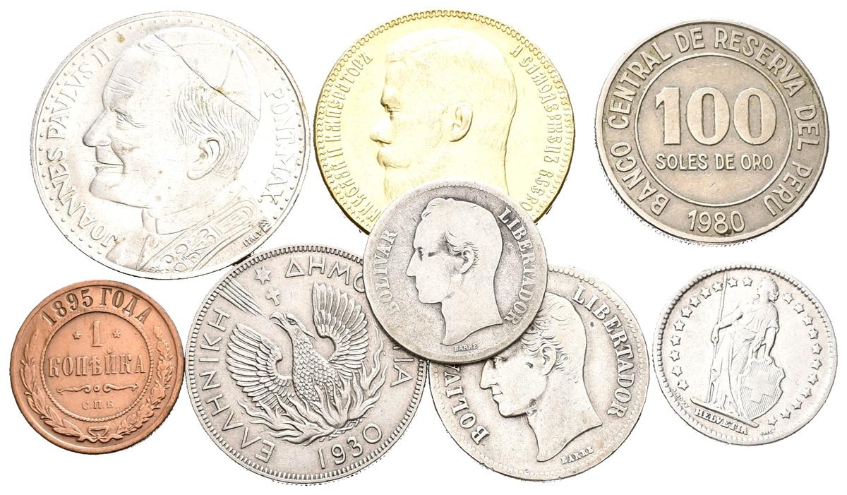 MONEDAS EXTRANJERAS. Lote compuesto por 8 monedas mundiales. Incluye piezas de plata así como reacuñación en cupro-niquel de los 37 rublos y 50 Kopecks de 1902 y medalla de Juan Pablo II. Diferentes estados de conservación. A EXAMINAR.