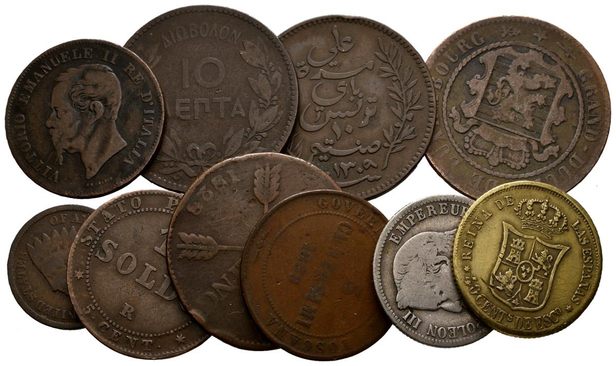 Lote de 10 monedas del siglo XIX de diferentes países, incluido España. Destacan 5 centesimi de Italia de 1861 y One Cent de USA de 1899. Diferentes conservaciones. A examinar.